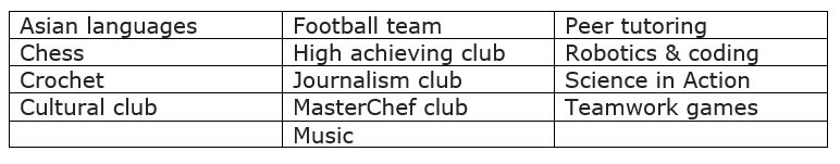 List of activities and clubs on offer:
